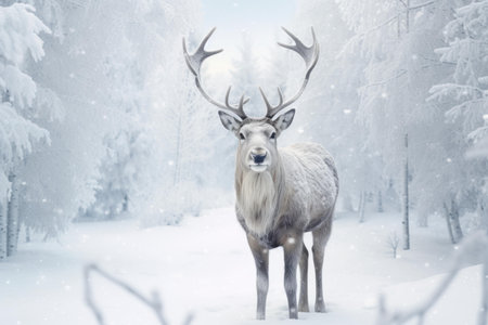 Majestic reindeer walking through snowy landscape with soft blue tones and serene atmosphere