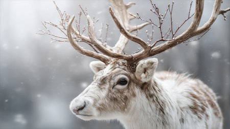 Beautiful close-up of a reindeer with snow-dusted fur and antlers in a serene winter forest, capturing the calm and beauty of Arctic wildlife.