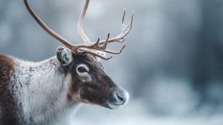 A stunning profile of a reindeer against a blurred winter backdrop, emphasizing its majestic antlers and soft fur in a peaceful, natural setting.