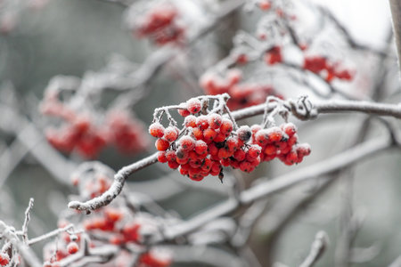Red rowan berries covered with frost in the winter morning landscape. Nature banner with a place for the text.