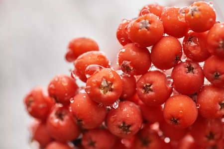 Closeup heap of fresh ripe rowan berries with dew drops placed on white blurred background