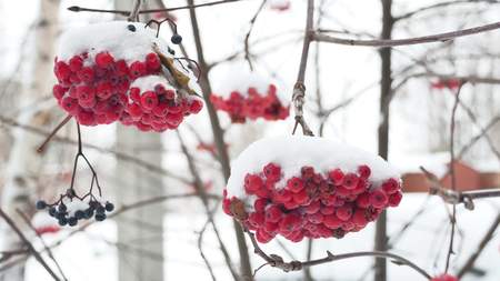 Bunches of berries rowan covered with snow