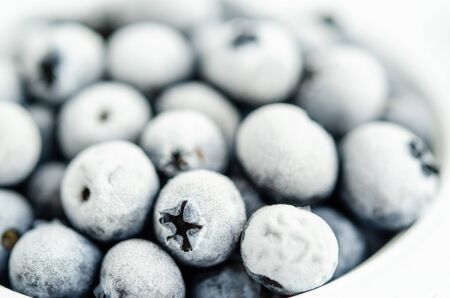 Frozen blueberries on a white background. Close up, season concept, season. Healthy nutrition, vitamins. Macro shot. Horizontal orientation