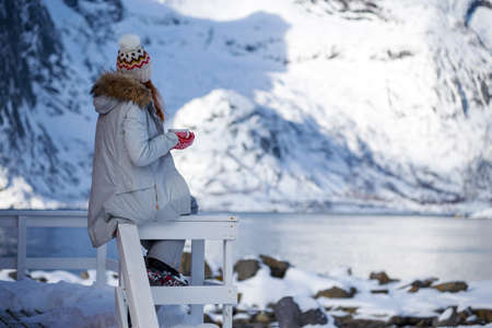 winter. girl with a cup on the background of rorbu on the Lofoten islands. Norway