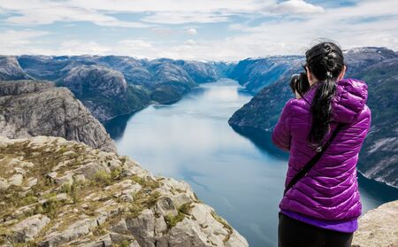 Nature photographer tourist with camera shoots while standing on top of the mountain. Beautiful Nature Norway Preikestolen or Prekestolen.