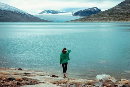 A young woman in a green sweater enjoys a bewitching view of a glacial lake Styggevatnet and a blue glacier in Norway. Incredibly beautiful nature of Norway. Active lifestyle. Traveling in Norway