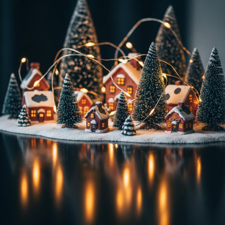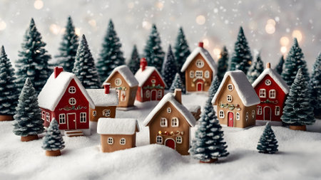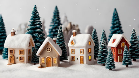 Winter. A Christmas card. Beautiful ceramic Scandinavian houses and Christmas trees. Festive mood, Christmas, New Year 2025