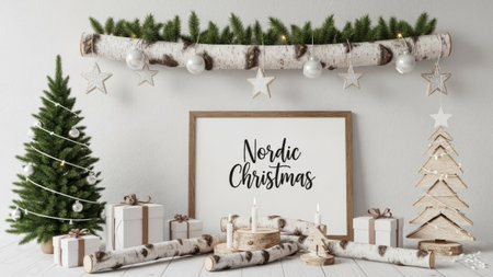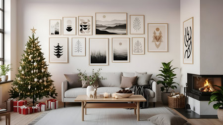 Stylish Scandinavian Christmas living room, neutral tones, tree with simple decor, kraft paper presents, and bright natural daylight