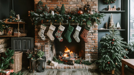 A cozy Christmas living room featuring a brick fireplace adorned with festive stockings, twinkling lights, and green decorations, evoking warmth and holiday cheer.