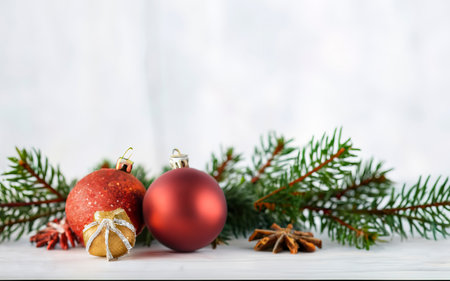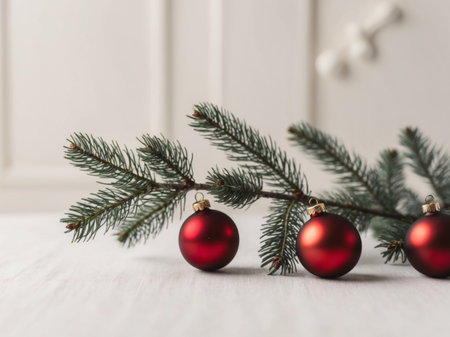Christmas tree branches with red, gold ornaments on white wood