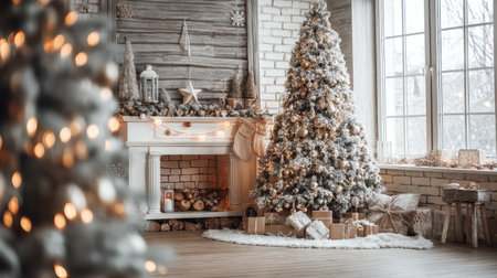 Christmas interior with fireplace, christmas tree, candles and gifts.