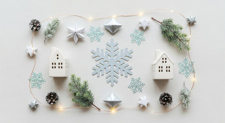 A charming winter scene unfolds with a delicate frosted tree, a textured star, and shimmering ornaments nestled among soft, natural elements. The gentle hues of white and gold create a serene atmosphere, evoking the warmth and joy of the holiday season.