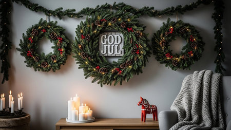 3d render of cozy living room with christmas wreath on wall