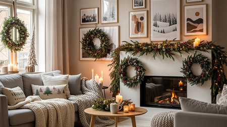 Cozy living room interior with fireplace, Christmas wreath and candles