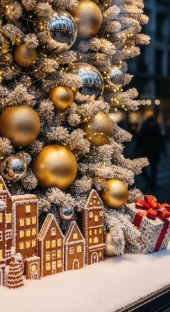 Festive christmas tree with golden ornaments and gingerbread houses in holiday display.