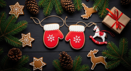 A festive holiday arrangement featuring two red mitten-shaped gingerbread cookies, surrounded by star and animal-shaped gingerbread, fresh fir branches, pine cones, a small gift, and a rocking horse ornament on a dark wooden surface, evoking a cozy winter atmosphere.