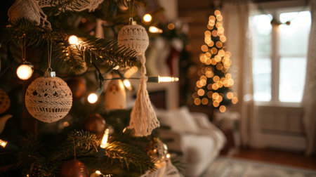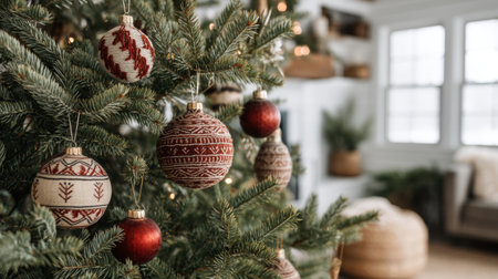 Close-up view of beautifully crafted Christmas ornaments hanging on a pine tree, creating a warm and inviting holiday atmosphere in a modern living space.