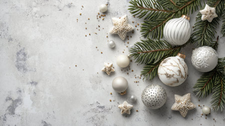 A beautifully arranged festive composition featuring silver ornaments, pine branches, and elegant gift boxes on a soft backdrop, perfect for enhancing holiday themes and moods.