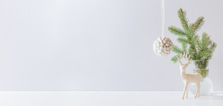 Christmas, New Year home decor. Empty white wall mock up with green fir branches in a vase, deer and ball on a white table. Mock up for display works