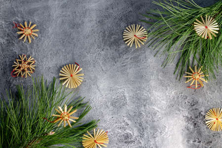 Christmas holiday background with board and decorations, gift boxes on the gray textured board View from above.