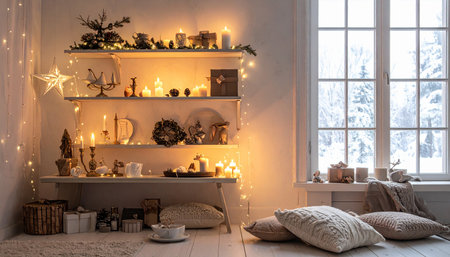 Warm living room interior decorated for Christmas with glowing candles, festive baubles, wreaths, and illuminated tree creating a cozy holiday atmosphere. Horizontal stock photo.