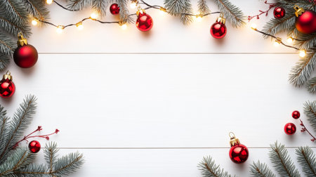 Festive Christmas scene with fir branches, ornaments, and lights.