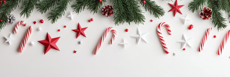 Festive Christmas panorama on a white background featuring red ornaments and green pine decorations.