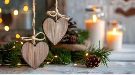 This enchanting image features rustic wooden heart ornaments gracefully hung amidst candles and pine branches, creating a cozy winter holiday atmosphere.