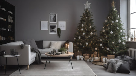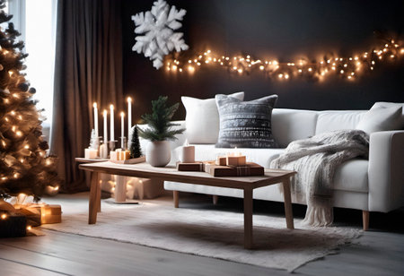 Cozy living room with Christmas tree, candles and sofa in the foreground