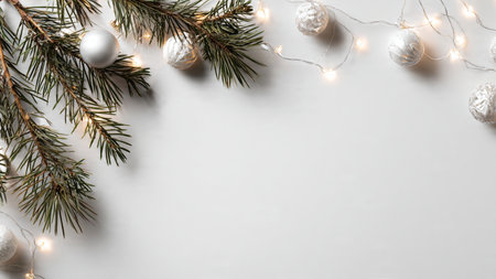 Premium stock image of a minimalist Christmas background with pine branches and fairy lights.
