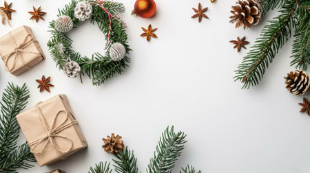 Overhead holiday composition with pine branches, glittery baubles, and gifts arranged around an empty wooden center, perfect for greetings or promotional text