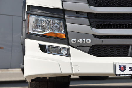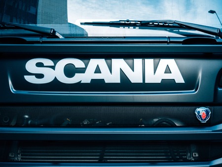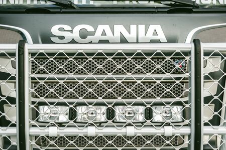 Vilnius, Lithuania - May 16: Scania truck detail on May 16, 2018 in Vilnius Lithuania. Scania is a major Swedish automotive industry manufacturer of commercial vehicles