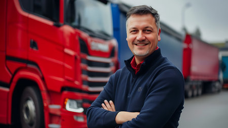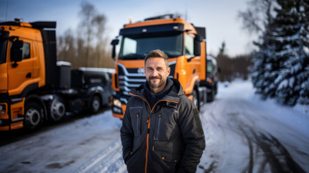 Portrait of a smiling male truck driver with arms crossed in front of semi-trucks on a winter day, showcasing professionalism and reliability in logistics.