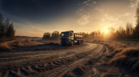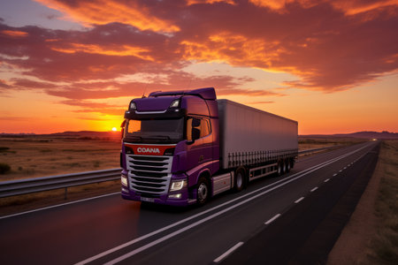 A large semi truck is driving down a road with a beautiful sunset in the background. The sky is filled with clouds, creating a moody atmosphere. The truck is the main focus of the image