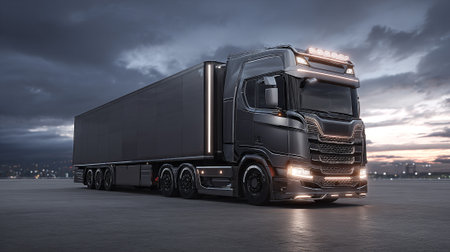 Sleek and Powerful: An Imposing Black Semi-Truck Against a Dramatic Skyline