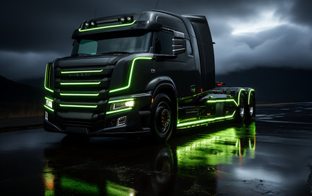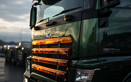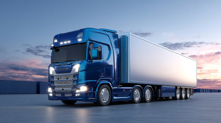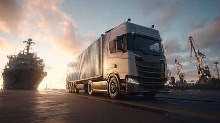 Sleek Semi Truck at Industrial Port Ready for Global Cargo Transportation