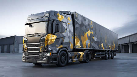 Sleek Semi-Truck with Geometric Camouflage Pattern Parked Near Loading Bay Docks