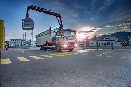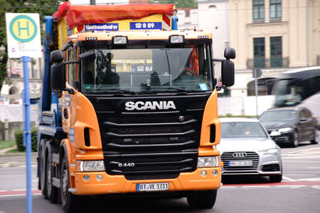 Munich, Germany - June 30, 2018: A Scania truck with container in the roundabout traffic in downtown on June 30, 2018 in Munich.