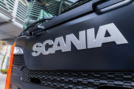 MUNICH / GERMANY - APRIL 14, 2019: Scania branch on a Scania truck. Scania AB is a major Swedish manufacturer of commercial vehicles – specifically heavy trucks and buses.