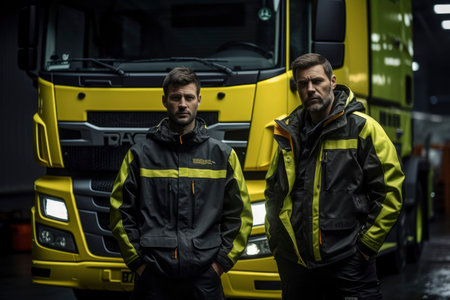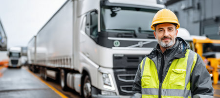 A professional driver stands beside a parked cargo truck in a loading zone, wearing a uniform and safety gear. The image captures a clean composition in daylight, emphasizing logistics.