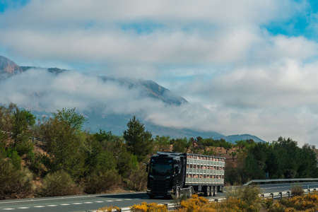 Cage truck for transporting livestock with a background of mountains and clouds.