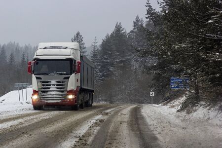 Tatarstan, Russia, Interstate Highway M7 - Nov 04th 2020. Trucks move along the federal highway to their destination. Foggy morning.