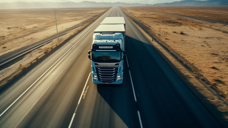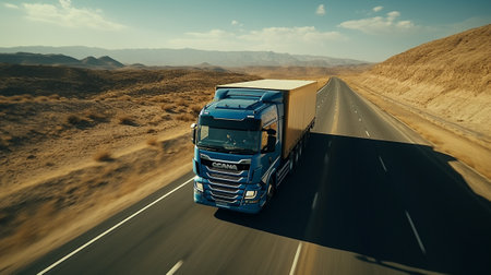 Truck with container on highway with sun light. Concept cargo transportation banner. Blur move effect