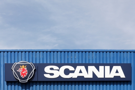 Horsens, Denmark - July 4, 2015: Scania sign on a wall. Scania is a major swedish automotive industry manufacturer of commercial vehicles specifically heavy trucks and buses