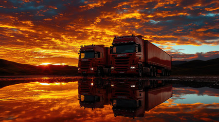 Experience the breathtaking beauty of a sunset reflecting on a tranquil surface, featuring striking red trucks against a colorful sky with vibrant clouds.