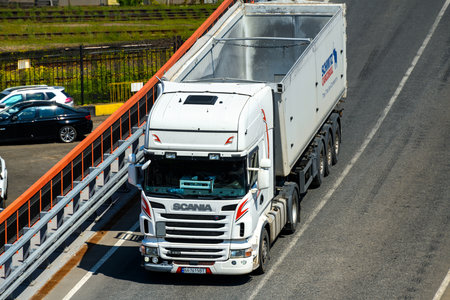 Loaded European truck in motion on asphalt road, transportation and delivery concept. Bucharest, Romania, 2020