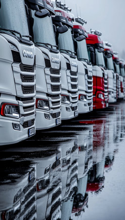 Fleet of Modern White Trucks Parked in a Row, Reflecting off Wet Asphalt on an Overcast Day