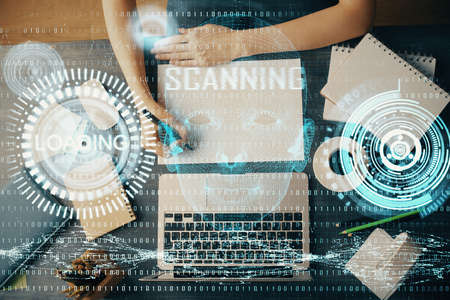 Double exposure of woman hands working on computer and data theme hologram drawing. Tech concept.