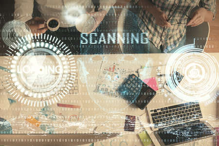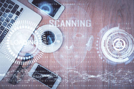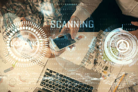 Close up of tablet with abstract round identification interface on blurry background. Forensic hud and scanner concept. double exposure