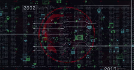 Displaying data dashboard in dark UI, with columns digital icons timeline markers red-circled globe. Analytics, cybersecurity, data visualization, ui design, information technology, digital interface, modern